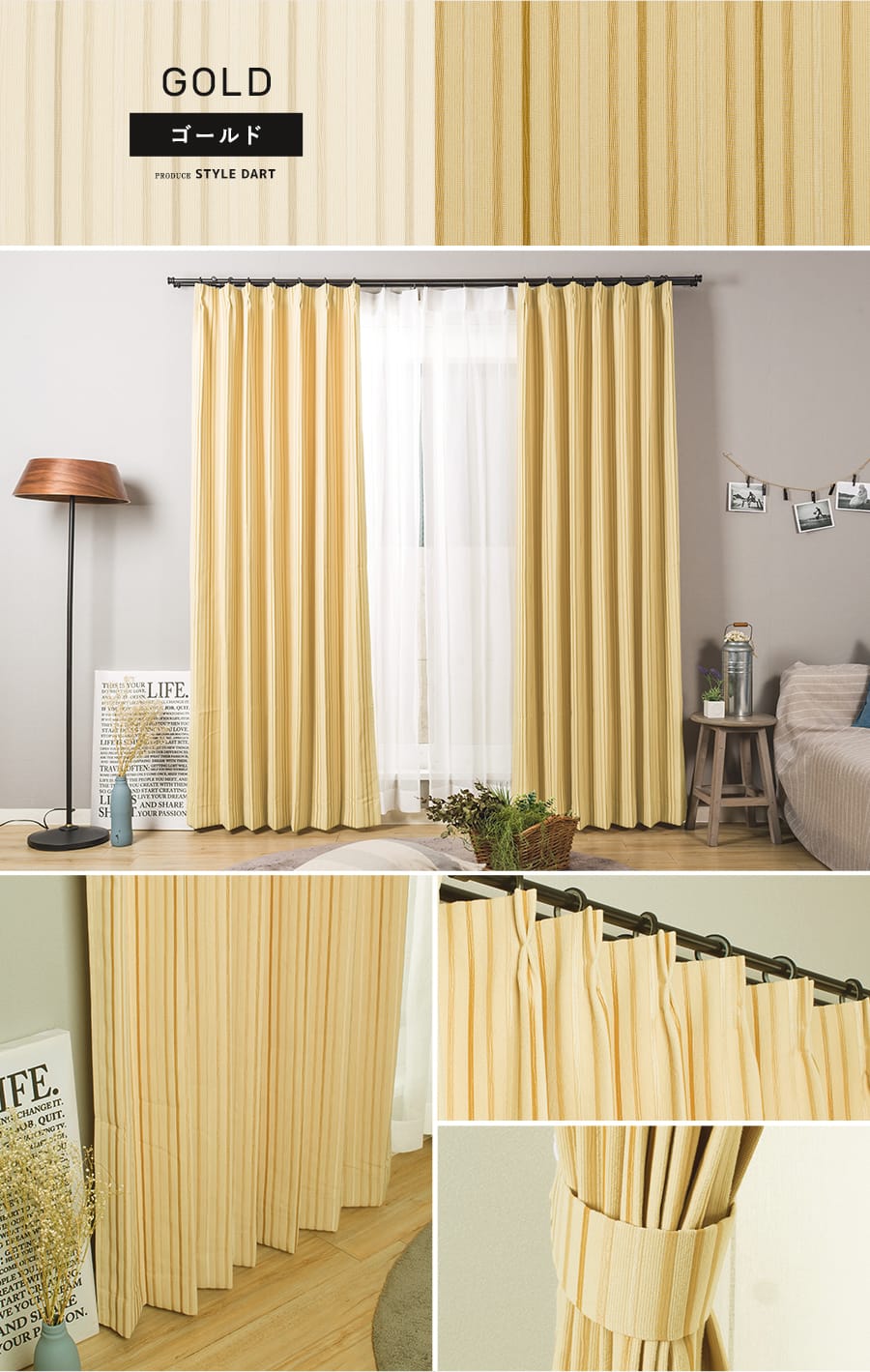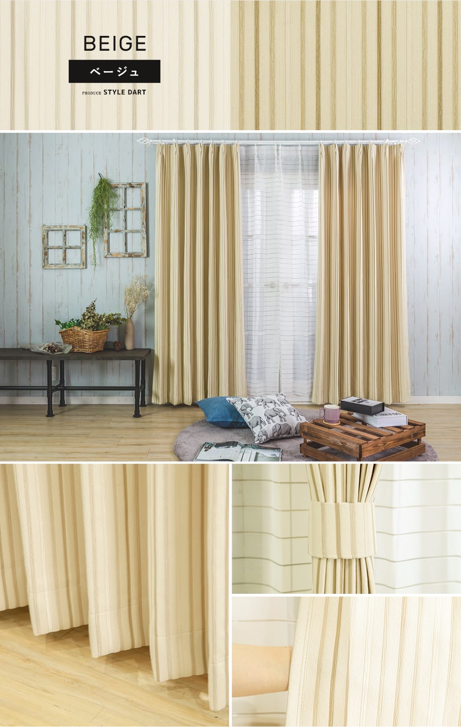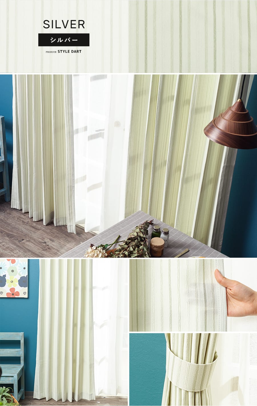 優しい手触りの生地を使った、縦ストライプが爽やかな印象のカーテン。色はシルバー、ベージュ、ゴールド、グリーン、ダークブラウンの5色をご用意しました。