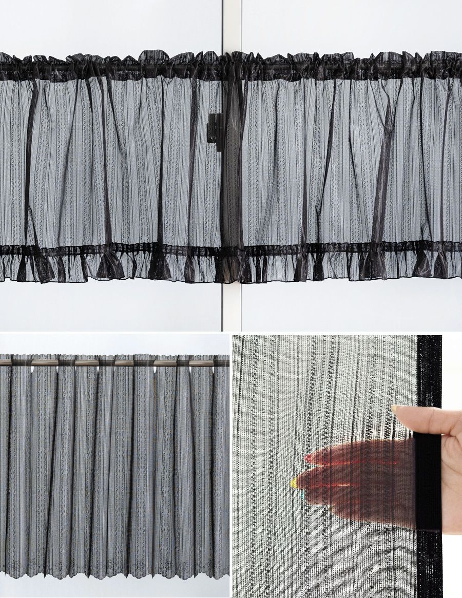 張り感のある手触りでしっかりした生地で、ブライト糸を使った少し光沢のある、シンプルな印象のブラックストライプレースカーテンです。