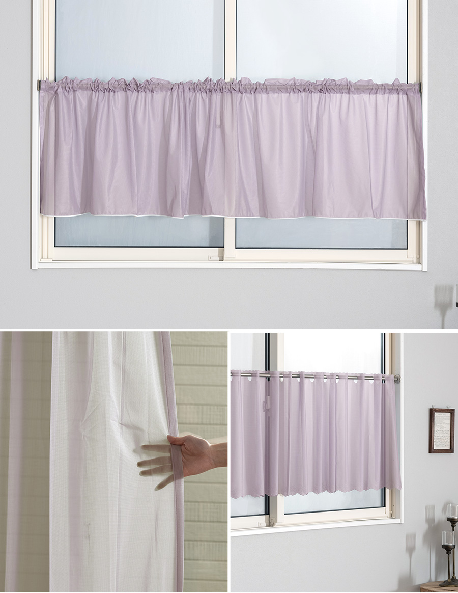 落ち着いたグレイッシュで流行のくすみカラーは無地なので使いやすく、美容室やサロンなど店舗や家庭のリビング、キッチン、寝室などどんな場所やインテリアにもおすすめ。出窓におすすめなスタイルレースのストレートやバルーン、フリルカフェカーテンなど製作可能でトータルコーディネートができます。