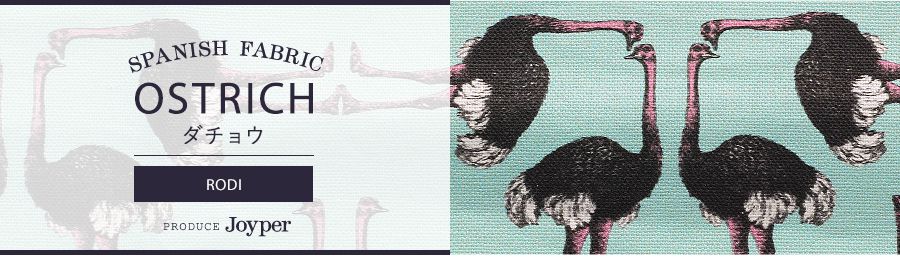 爽やかなブルーのベースにダチョウ柄が幾何学的に配された珍しいデザインで、この生地一枚で個性が光るコーディネートに。