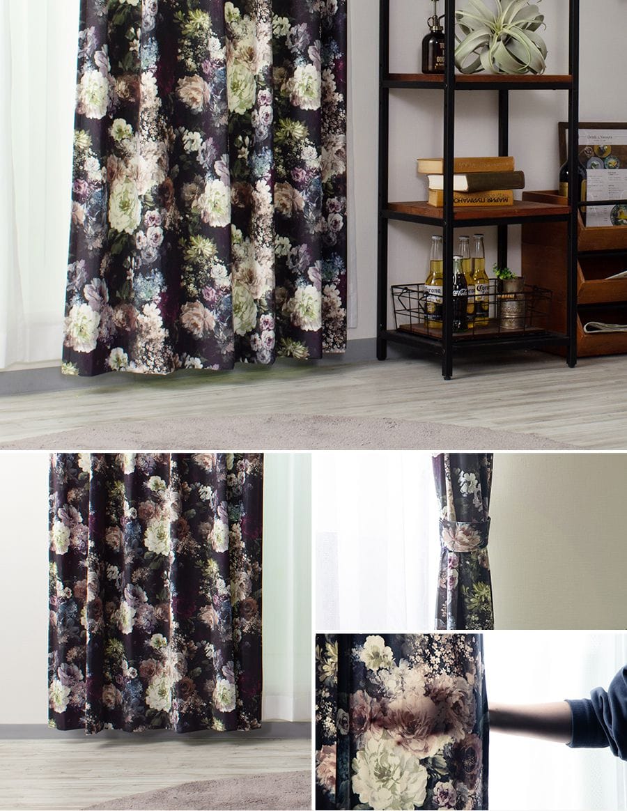 さらりとした手触りが気持ちいいベロア生地。 毛足が短いのでお手入れがしやすく、柄プリントもはっきりしています。 ピオニーやフリージア、ライラックなどの美しい花々が描かれた華やかな柄。 背景の黒に浮かび上がるような花はかわいいよりかっこいいイメージ。