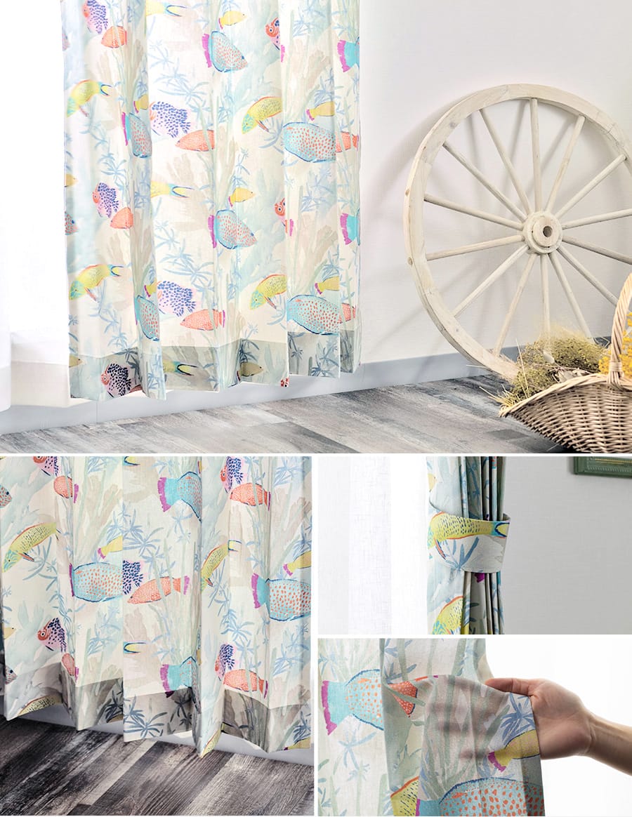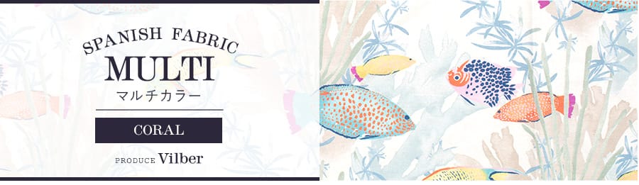 水色、黄色、赤と色とりどりの熱帯魚たちがサンゴ礁の海を泳ぐかわいいお魚柄がデザインされた生地。スペインらしいカラーリングとデザインはお部屋のちょっとしたアクセントとしてもぴったりです。