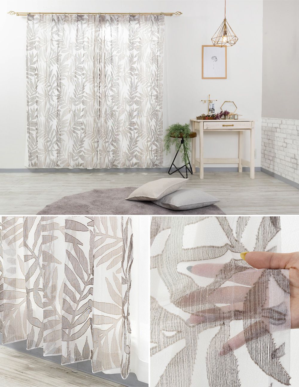 透け感の強いネップのある白いレースに、ベージュやブラウンの糸で南国テイストな葉模様が織り込まれたジャガードカットレース。 使いやすいナチュラルカラーはシンプルな厚地カーテンの組み合わせのワンポイントとしても。