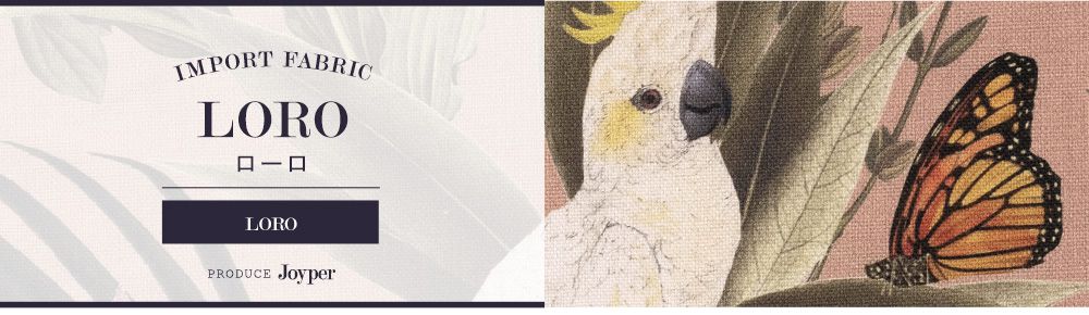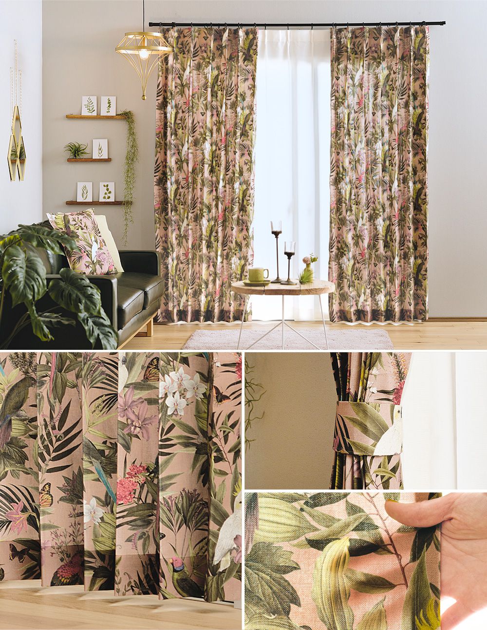 オーガニックコットン100%の張りのある平織の生地にボタニカル柄をプリント。 植物に集うオウムや蝶がポイントとして描かれたユニークなデザインで、 まるで楽園にいるような気分になれるカーテンです。