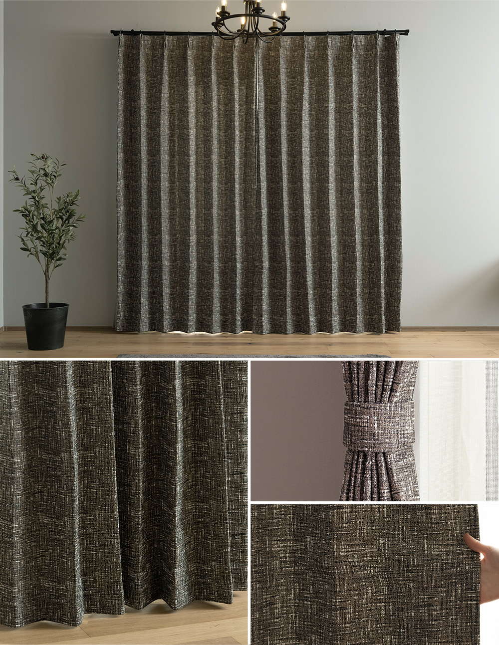 高級感のある、ツイード風の生地で、ホテルライクなかっこいいインテリアにおすすめ。ホワイトのモール糸が織り込まれた生地はふんわりと柔らかく、しっかりとした厚みがあるので窓からの冷気や熱気を防ぐ保温効果があります。