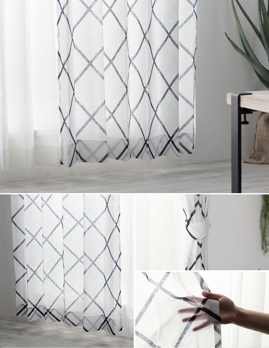 モノトーンなカラーに斜めに構成された格子柄(ダイアゴナルチェック)がデザインされたファブリック。光を取り込む透け感のある生地なのでレース使いにするのもおしゃれです。シンプルな柄なのでどんなお部屋のインテリアにもピッタリなデザインの生地です。