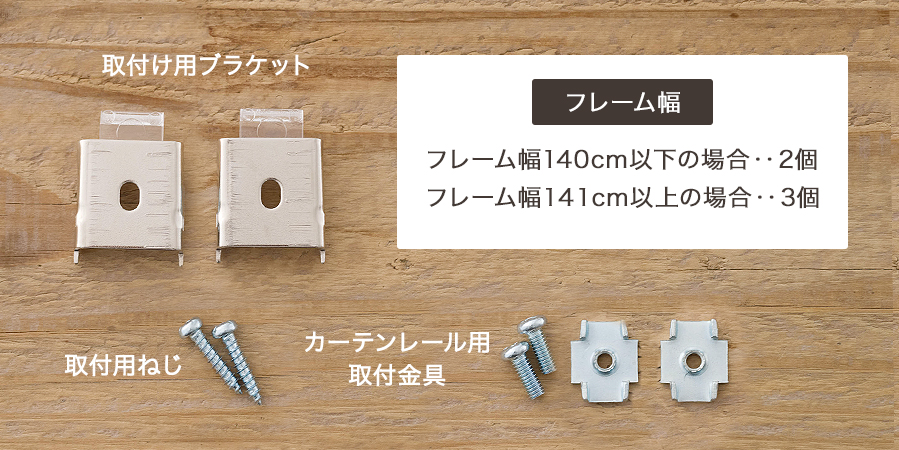 | 付属品 | ![]() カーテンレール用取付金具は、カーテンレールに取り付ける際に必要となります。壁、窓枠、天井に直接取り付ける場合は必要ありません。 |